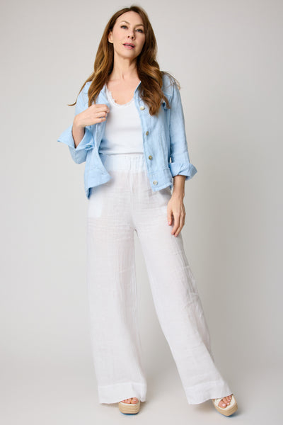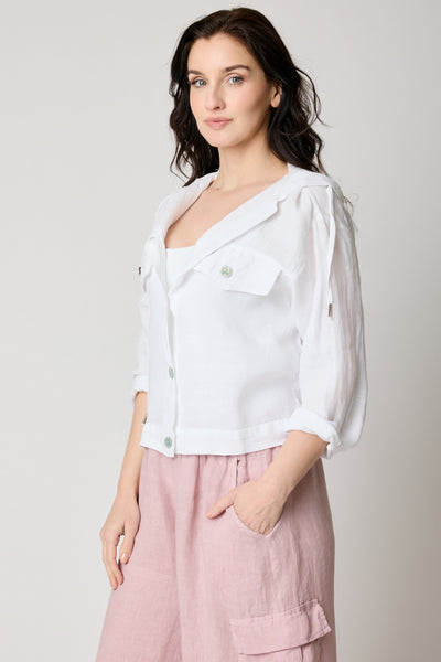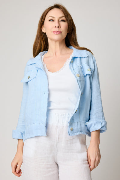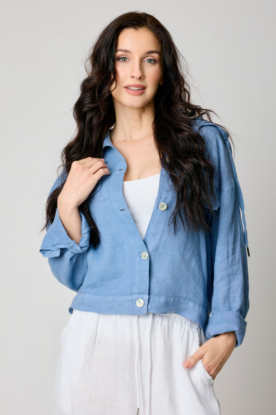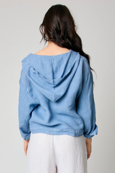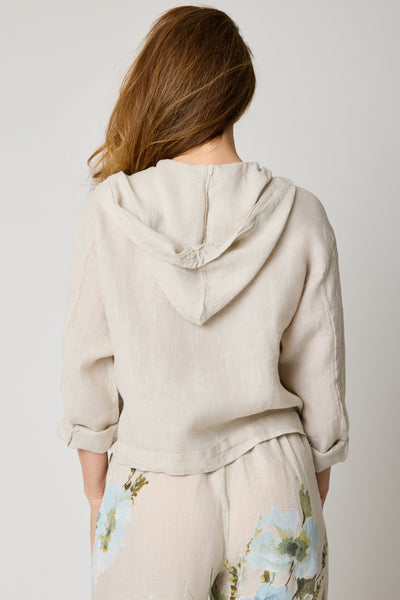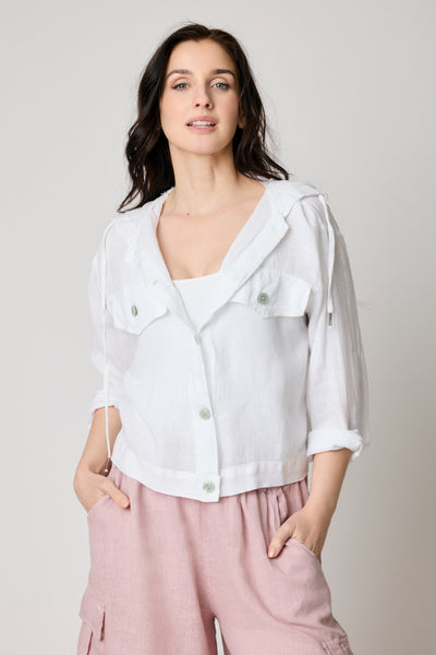 Crafted from lightweight linen, this piece delivers natural texture with effortless drape. The hood detail and button-front closure add casual versatility, while the one size fit allows for easy layering over dresses, tees, or matching sets.