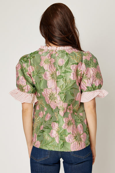 The Brocade Metallic Top with Candy Stripe Detail is the perfect piece to bring a pop of personality and modern glamour to your wardrobe.