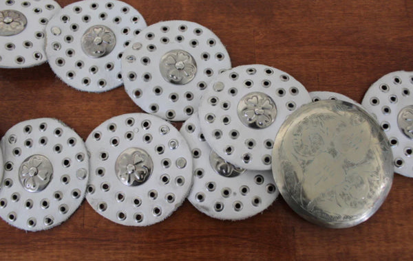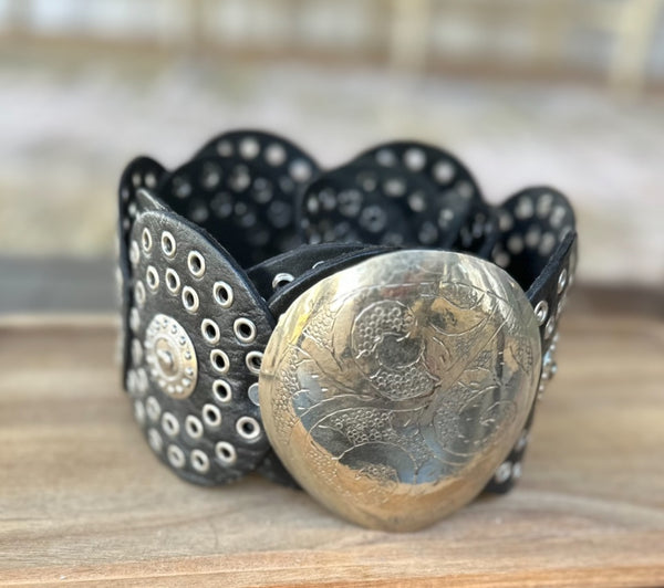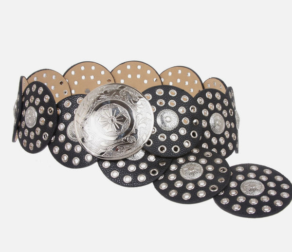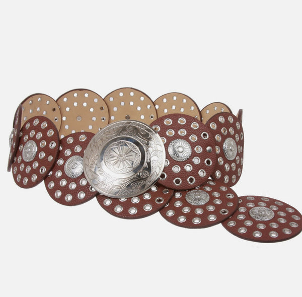 The Western Leather Concho Belt is a bold statement accessory inspired by classic Southwestern style. Featuring large round brown leather discs with detailed silver conchos, this belt brings instant cowgirl chic to any outfit. The unique handcrafted design makes it perfect for rodeo looks, western events, or adding a striking edge to everyday wear.