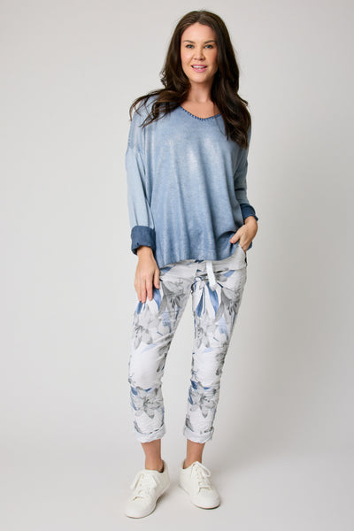 The Blue Floral Italian Stretch Pant combines effortless comfort with refined European styling. Designed in a soft blue and grey floral print, this silhouette offers a flattering, modern fit with everyday versatility.