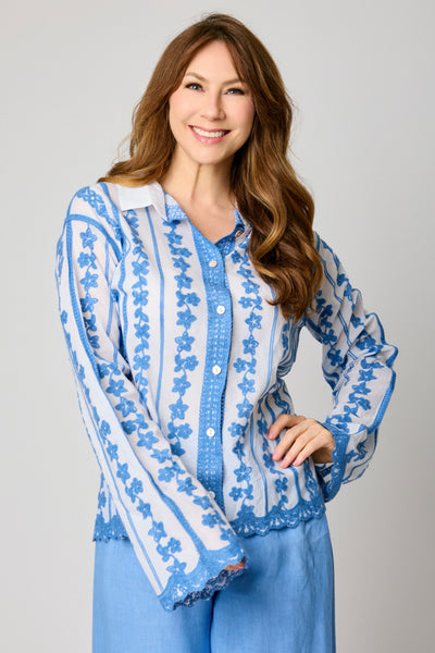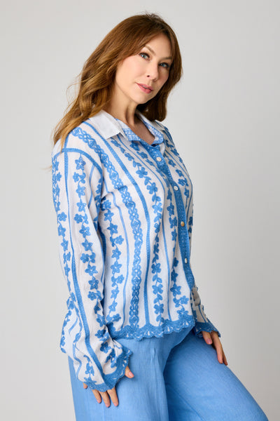 Lightweight with graceful structure, the blouse features a classic button-front design and beautifully finished edges for added refinement. The embroidered detailing adds texture and dimension, creating a standout piece that remains versatile for everyday styling.