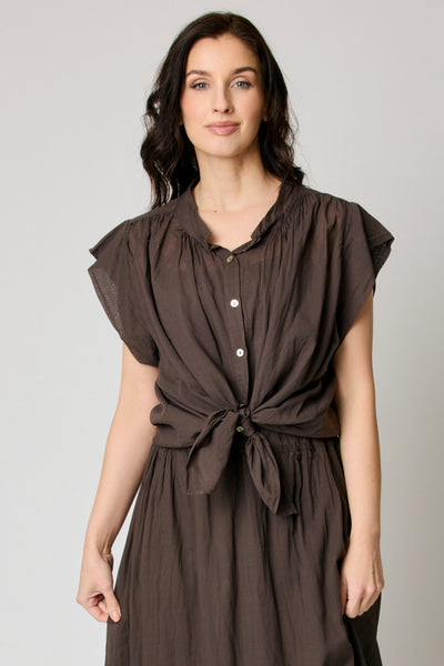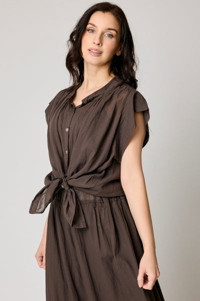 Crafted from breathable voile fabric, it drapes beautifully while remaining lightweight and comfortable. The short sleeves create a clean, modern shape, making it perfect for warm-weather styling or layering under tailored pieces.