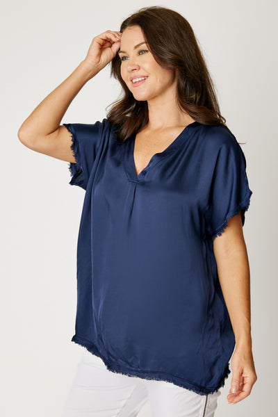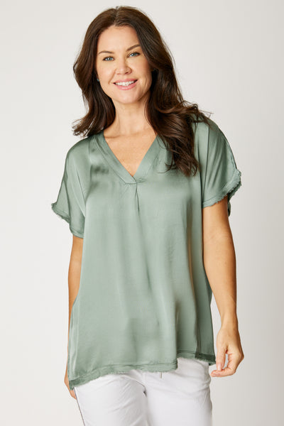 The Satin V-Neck Raw Edge Tee blends casual comfort with a touch of luxury, making it a perfect go-to for any occasion. Featuring a silky satin front for a polished look and raw edge detailing for a subtle, undone vibe, this tee offers a relaxed yet flattering fit that drapes beautifully.
