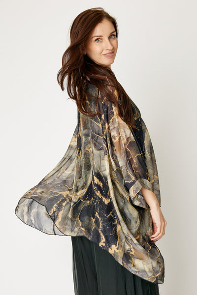 The Italian Silk Black Marble Flowing Top is a wearable work of art. Made in Italy from a luxe blend of 30% silk and 70% viscose, it drapes fluidly with a lightweight, airy feel. The marble-inspired print in rich green tones adds a modern, artistic touch, while the one-size silhouette flatters a variety of body types with ease.